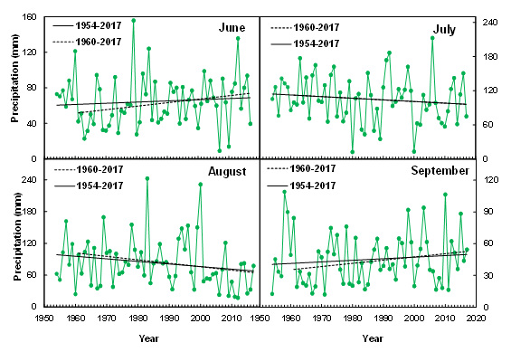 Figure 1. Temporal trends of precipitation in June, July, August, and September from 1954 to 2017 and from 1960 to 2017.