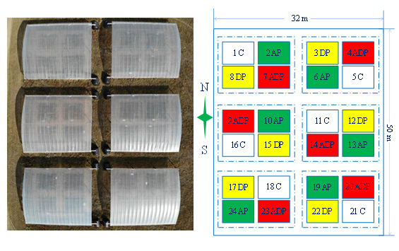 The polyethylene roofs were added by the end of May and removed by the end of September to allow all the plots to receive natural precipitation from October to May in the next year. During the time periods from June to September, natural precipitation was intercepted by the rainout shelters, collected, stored in 8 black plastic buckets, and applied manually back to the plots assigned to the 4 treatments. The years with both rainfall size and frequency from June to September close to the long-term means were selected to simulate natural precipitation in the local area.