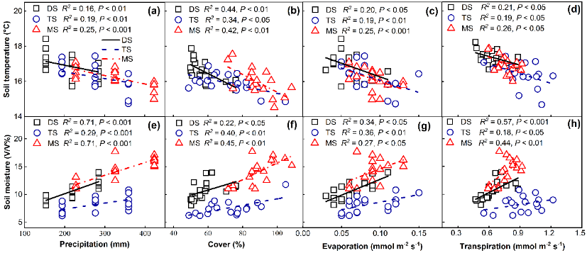 图1.土壤温湿度与降雨量、盖度、蒸发、蒸腾的相关关系(DS:荒漠草原;TS:典型草原;MS:草甸草原)。