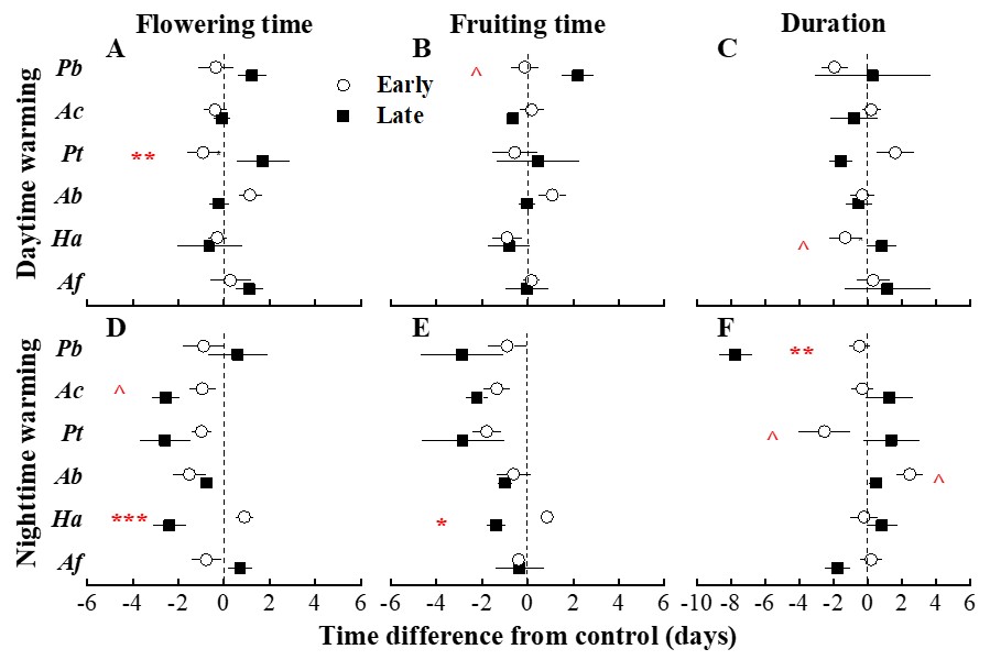 Flowering and fruiting times were advanced of early-blooming species by nighttime warming, but were not significantly affected by daytime warming. Species-specific responses of plant phenology and differences in response to short- vs long-term warming were detected under nighttime warming.