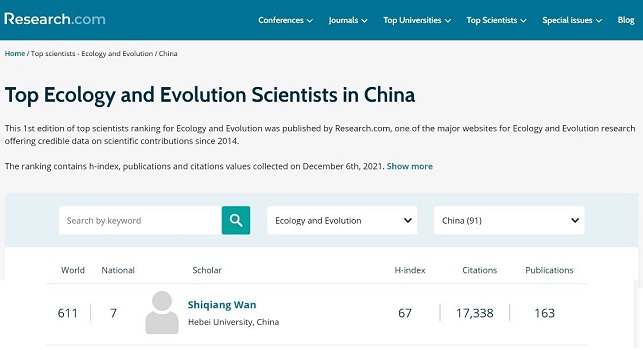 近期,Research.com网站发布Ecology & Evolution (生态和演化)领域91位中国顶尖科学家榜单。课题组PI万师强教授入选该榜单。